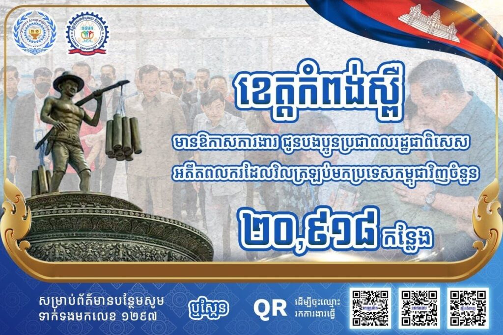 តាមរយៈការផ្សព្វផ្សាយ ក្រសួងការងារបានឱ្យដឹងថា គិតត្រឹមថ្ងៃទី ១៣ ខែមេសា ឆ្នាំ២០២៦នេះ ខេត្តកំពង់ចាម ខេត្តកំពង់ឆ្នាំង និងខេត្តកំពង់ធំមានឱកាសការងារសរុបចំនួន ២០,៩១៨កន្លែង កំពុងរង់ចាំបងប្អូនអតីតពលករត្រឡប់មកពីប្រទេសថៃ និងអ្នកកំពុងស្វែងរកការងារធ្វើនៅក្នុងវិស័យកសិកម្ម ឧស្សាហកម្ម និងវិស័យសេវាកម្ម។