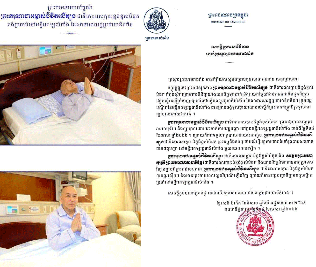 ព្រះករុណាជាអម្ចាស់ជីវិតលើត្បូង បានសព្វព្រះរាជហឫទ័យទទួលការព្យាបាល ដោយវះកាត់តាមវេជ្ជបញ្ជា នៅមន្ទីរពេទ្យរដ្ឋធានីប៉េកាំង ចាប់ពីថ្ងៃទី១៨ ខែមេសា ឆ្នាំ២០២៦ នេះ។ ក្រោយពីការវះកាត់បានជោគជ័យ ព្រះអង្គនឹងបន្តគង់ប្រថាប់មួយរយៈដដែល នៅទីក្រុងប៉េកាំង ដើម្បីឱ្យក្រុមគ្រូពេទ្យតាមដាន និងថែទាំព្រះរាជសុខភាពឱ្យបានពេញលេញ ។