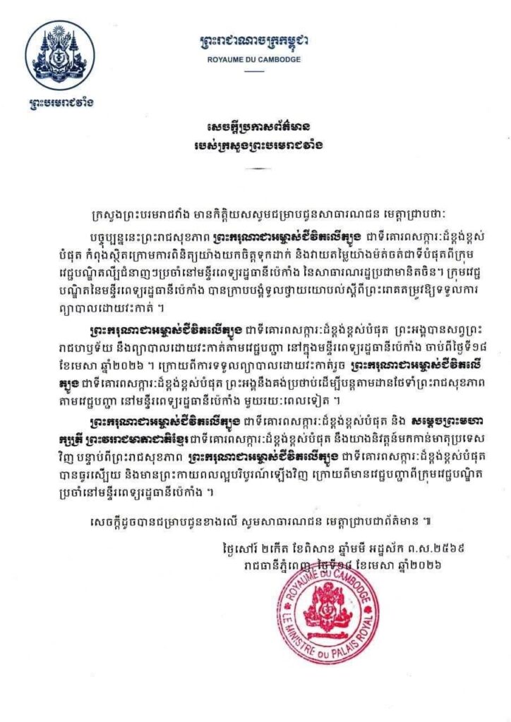 ភ្នំពេញ៖ ក្រសួងព្រះបរមរាជវាំង នៅថ្ងៃទី១៨ ខែមេសា ឆ្នាំ២០២៦ នេះ បានចេញសេចក្តីប្រកាសព័ត៌មានស្តីពីស្ថានភាពព្រះរាជសុខភាពរបស់ ព្រះករុណា ព្រះបាទសម្តេចព្រះបរមនាថ នរោត្តម សីហមុនី ព្រះមហាក្សត្រ នៃព្រះរាជាណាចក្រកម្ពុជា ខណៈដែលព្រះអង្គកំពុងគង់ប្រថាប់ ទទួលការពិនិត្យព្រះរាជសុខភាព នៅរដ្ឋធានីប៉េកាំង ប្រទេសចិន ។