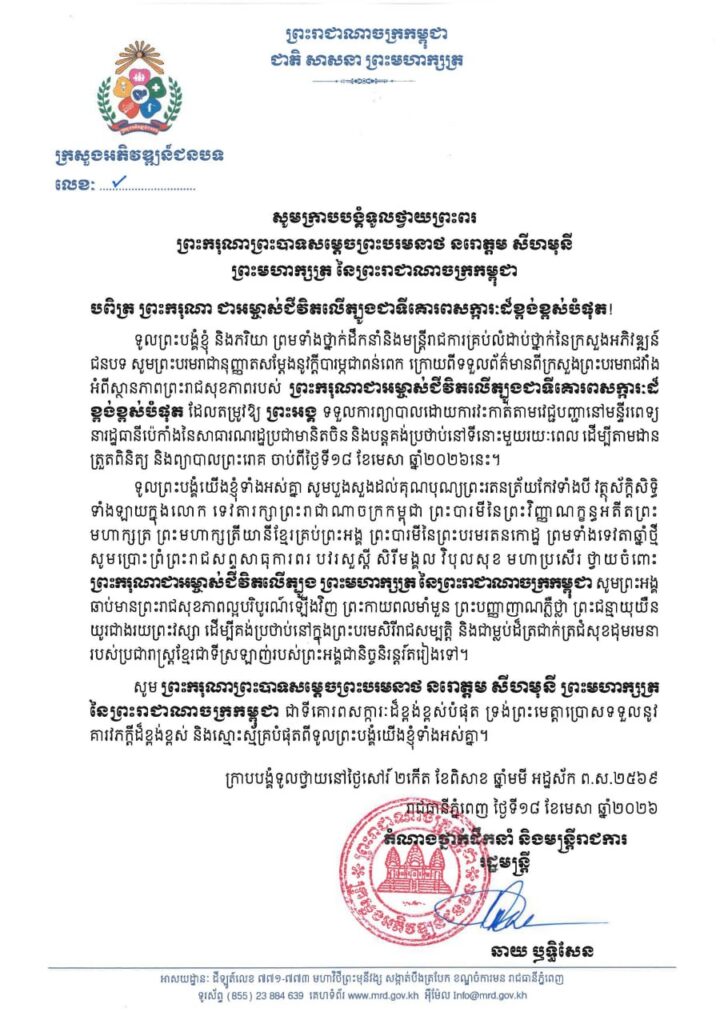 ទូលព្រះបង្គំយើងខ្ញុំទាំងអស់គ្នាជាថ្នាក់ដឹកនាំនិងមន្ត្រីរាជការគ្រប់លំដាប់ថ្នាក់នៃក្រសួងអភិវឌ្ឍន៍ជនបទ សូមបួងសួងដល់គុណបុណ្យព្រះរតនត្រ័យកែវទាំងបី វត្ថុស័ក្តិសិទ្ធិ ទាំងឡាយក្នុងលោក ទេវតារក្សាព្រះរាជាណាចក្រកម្ពុជា ព្រះបារមីនៃព្រះវិញ្ញាណក្ខន្ធអតីតព្រះមហាក្សត្រ ព្រះមហាក្សត្រីយានីខ្មែរគ្រប់ព្រះអង្គ ព្រះបារមីនៃព្រះបរមរតនកោដ្ឋ ព្រមទាំងទេវតាឆ្នាំថ្មីសូមប្រោះព្រំព្រះរាជសព្ទសាធុការពរ បវរសួស្តី សិរីមង្គល វិបុលសុខ មហាប្រសើរ ថ្វាយចំពោះ ព្រះករុណាជាអម្ចាស់ជីវិតលើត្បូង ព្រះមហាក្សត្រ នៃព្រះរាជាណាចក្រកម្ពុជា សូមព្រះអង្គឆាប់មានព្រះរាជសុខភាពល្អបរិបូរណ៍ឡើងវិញ ព្រះកាយពលមាំមួន ព្រះបញ្ញាញាណភ្លឺថ្លា ព្រះជន្មាយុយឺនយូរជាងរយព្រះវស្សា ដើម្បីគង់ប្រថាប់នៅក្នុងព្រះបរមសិរីរាជសម្បត្តិ និងជាម្លប់ដ៏ត្រជាក់ត្រជំសុខដុមរមនារបស់ប្រជារាស្ត្រខ្មែរជាទីស្រឡាញ់របស់ព្រះអង្គជានិច្ចនិរន្តរ៍តរៀងទៅ។