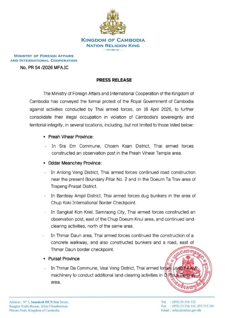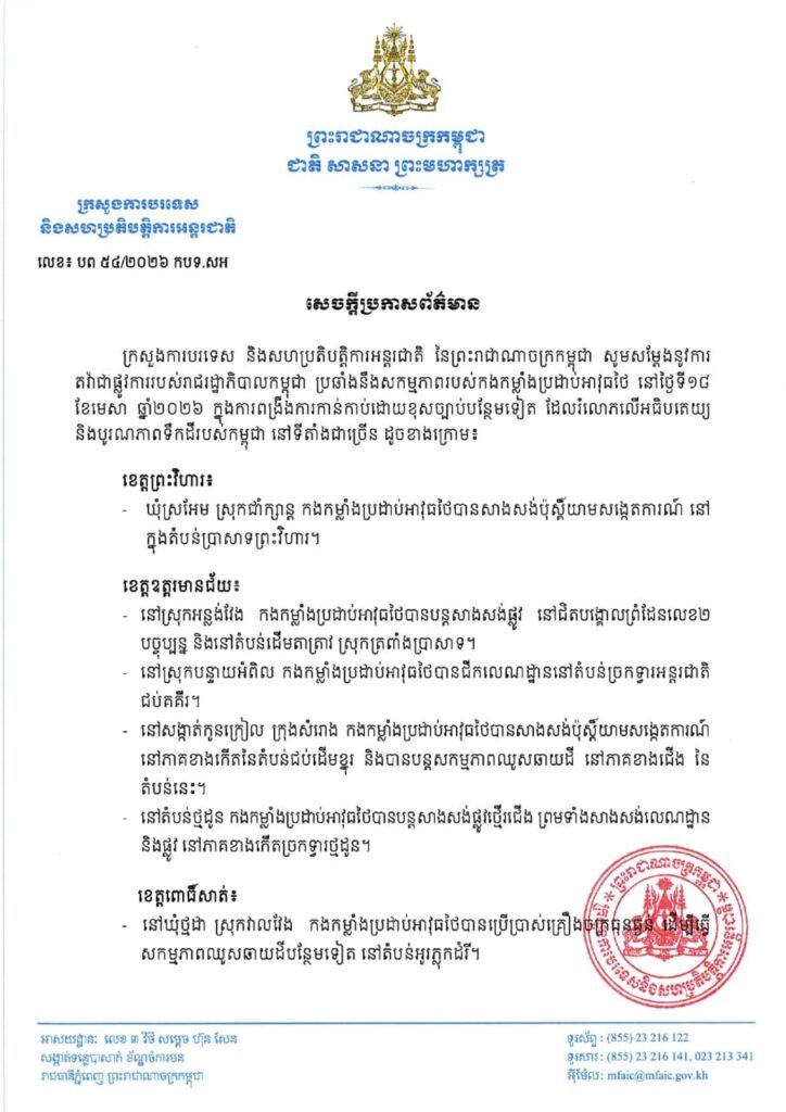 ភ្នំពេញ ៖ ក្រសួងការបរទេស និង សហប្រតិបត្តិការអន្តរជាតិ នៃព្រះរាជាណាចក្រកម្ពុជា បានចេញសេចក្តីប្រកាសព័ត៌មាន តវ៉ាជាផ្លូវការរបស់រាជរដ្ឋាភិបាលកម្ពុជា ប្រឆាំងនឹងសកម្មភាពរបស់កងកម្លាំងប្រដាប់អាវុធថៃ នៅថ្ងៃទី១៨ ខែមេសា ឆ្នាំ២០២៦ ក្នុងការពង្រឹងការកាន់កាប់ដោយខុសច្បាប់បន្ថែមទៀត ដែលរំលោភលើអធិបតេយ្យ និងបូរណភាពទឹកដីរបស់កម្ពុជា នៅទីតាំងជាច្រើន។