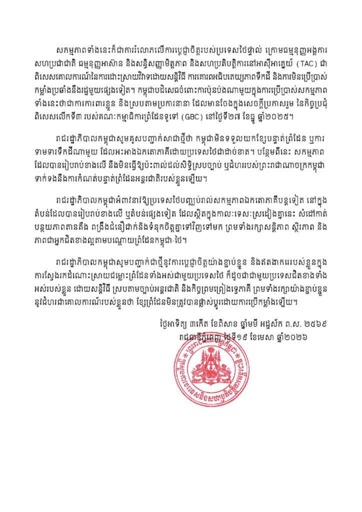 កម្ពុជាបដិសេធ ចំពោះការប៉ុនប៉ងណាមួយក្នុងការប្រើប្រាស់សកម្មភាព ទាំងនេះថាជាការការពារខ្លួន និងស្របតាមប្រការនានា ដែលមានចែង ក្នុងសេចក្តីប្រកាសរួម នៃកិច្ចប្រជុំ ពិសេសលើកទី៣ របស់គណៈកម្មាធិការព្រំដែនទូទៅ (GBC) នៅថ្ងៃទី២៧ ខែធ្នូ ឆ្នាំ២០២៥។