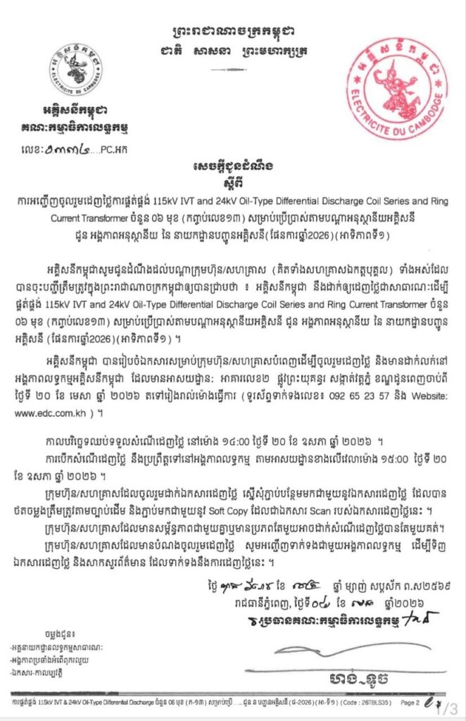 ភ្នំពេញ ៖ អគ្គិសនីកម្ពុជា សូមជូនដំណឹង ដល់បណ្តាក្រុមហ៊ុន/សហគ្រាស (គិតទាំងសហគ្រាសឯកត្តបុគ្គល) ទាំងអស់ដែល បានចុះបញ្ជីត្រឹមត្រូវ ក្នុងព្រះរាជាណាចក្រកម្ពុជា ឲ្យបានជ្រាបថា ៖ អគ្គិសនីកម្ពុជា នឹងដាក់ឲ្យដេញថ្លៃ ជាសាធារណៈដើម្បី ផ្គត់ផ្គង់ 115kV IVT and 24kV Oil-Type Differential Discharge Coil Series and Ring Current Transformer ចំនួន ០៦ មុខ (កញ្ចប់លេខ១៣) សម្រាប់ប្រើប្រាស់ តាមបណ្តា អនុស្ថានីយអគ្គិសនី ជូន អង្គភាពអនុស្ថានីយ នៃ នាយកដ្ឋានបញ្ជូន អគ្គិសនី (ផែនការឆ្នាំ2026) (អាទិភាពទី១) ។