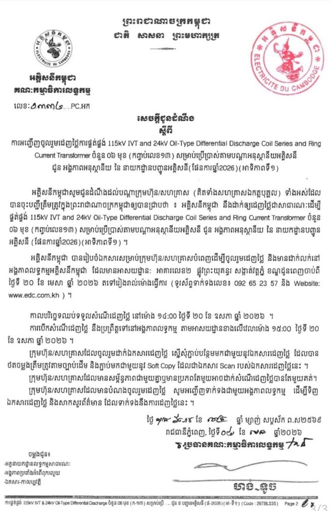 ភ្នំពេញ ៖ អគ្គិសនីកម្ពុជា សូមជូនដំណឹងដល់បណ្តាក្រុមហ៊ុន/សហគ្រាស (គិតទាំងសហគ្រាសឯកត្តបុគ្គល) ទាំងអស់ដែល បានចុះបញ្ជីត្រឹមត្រូវ ក្នុងព្រះរាជាណាចក្រកម្ពុជាឲ្យបានជ្រាបថា ៖ អគ្គិសនីកម្ពុជា នឹងដាក់ឲ្យដេញថ្លៃជាសាធារណៈដើម្បី ផ្គត់ផ្គង់ 115kV IVT and 24kV Oil-Type Differential Discharge Coil Series and Ring Current Transformer ចំនួន ០៦ មុខ (កញ្ចប់លេខ១៣) សម្រាប់ប្រើប្រាស់តាមបណ្តាអនុស្ថានីយអគ្គិសនី ជូន អង្គភាពអនុស្ថានីយ នៃ នាយកដ្ឋានបញ្ជូន អគ្គិសនី (ផែនការឆ្នាំ2026) (អាទិភាពទី១) ។