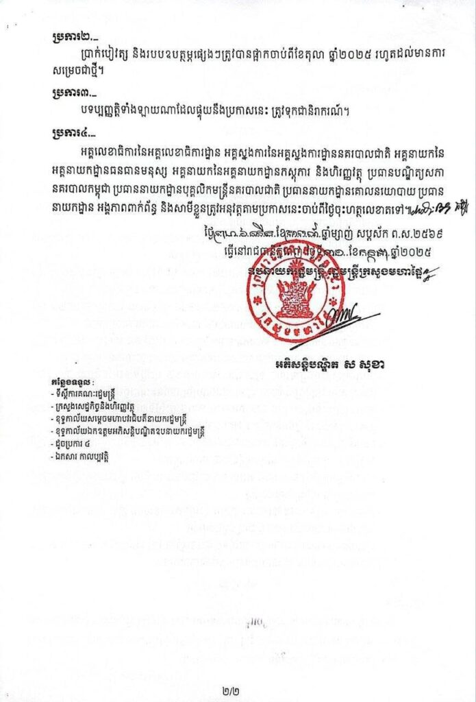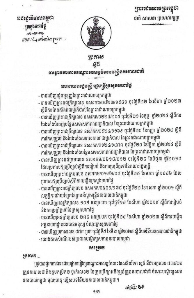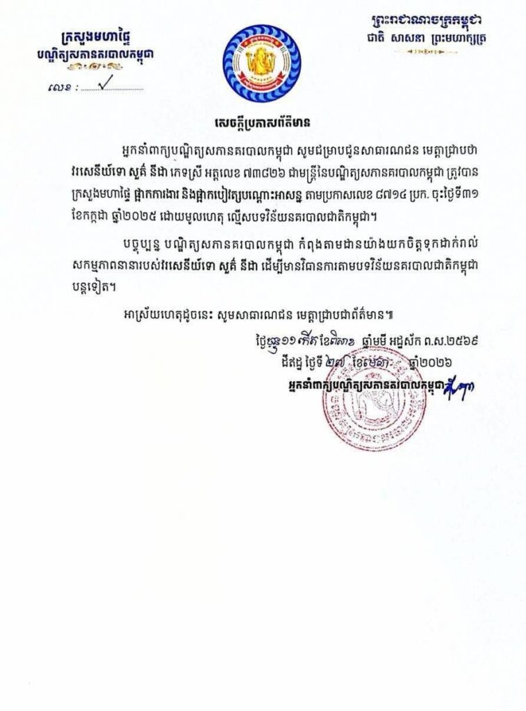 សូមរំលឹកថា កាលពីថ្ងៃទី៣១ ខែកក្កដា ឆ្នាំ២០២៥ ក្រសួងមហាផ្ទៃ បានដាក់ទណ្ឌកម្ម វរសេនីយ៍ទោ សួគ៌ នីដា តាមរូបភាពផ្អាកការងារ និងផ្អាកបៀវត្សបណ្ដោះអាសន្ន ដោយមូលហេតុល្មើសបទវិន័យ នគរបាលជាតិកម្ពុជា៕
