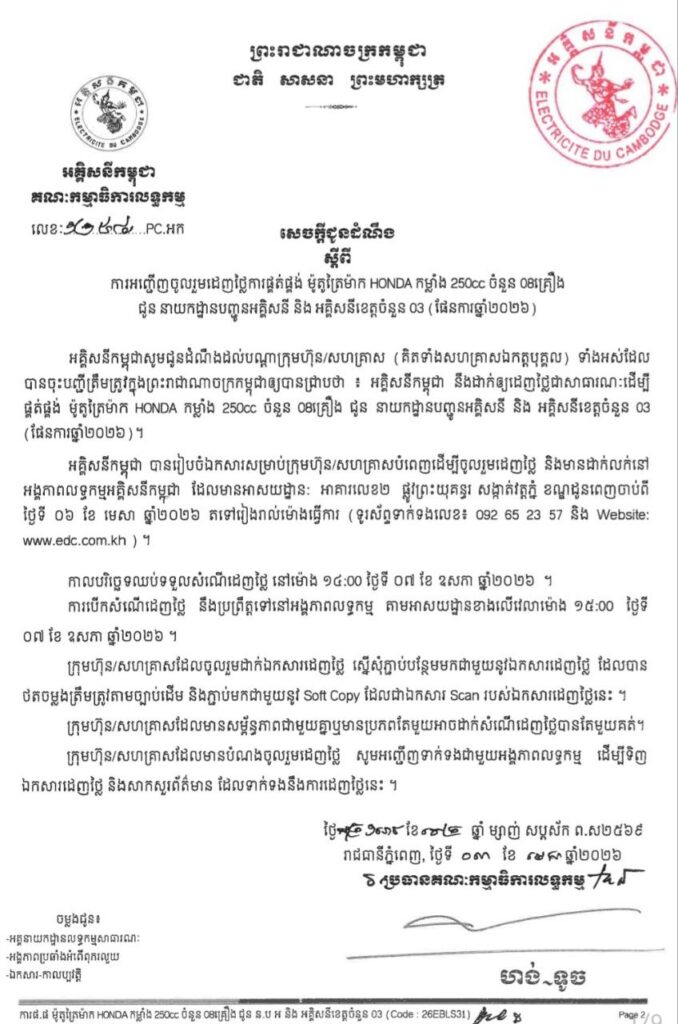 ភ្នំពេញ ៖ អគ្គិសនីកម្ពុជា សូមជូនដំណឹង ដល់បណ្តាក្រុមហ៊ុន/សហគ្រាស (គិតទាំងសហគ្រាសឯកត្តបុគ្គល) ទាំងអស់ដែល បានចុះបញ្ជីត្រឹមត្រូវ ក្នុងព្រះរាជាណាចក្រកម្ពុជា ឲ្យបានជ្រាបថា ៖ អគ្គិសនីកម្ពុជា នឹងដាក់ឲ្យដេញថ្លៃ ជាសាធារណៈដើម្បី ផ្គត់ផ្គង់ ម៉ូតូត្រៃម៉ាក HONDA កម្លាំង 250cc ចំនួន 08គ្រឿង ជូន នាយកដ្ឋានបញ្ជូនអគ្គិសនី និង អគ្គិសនីខេត្តចំនួន 03 (ផែនការឆ្នាំ២០២៦) ។