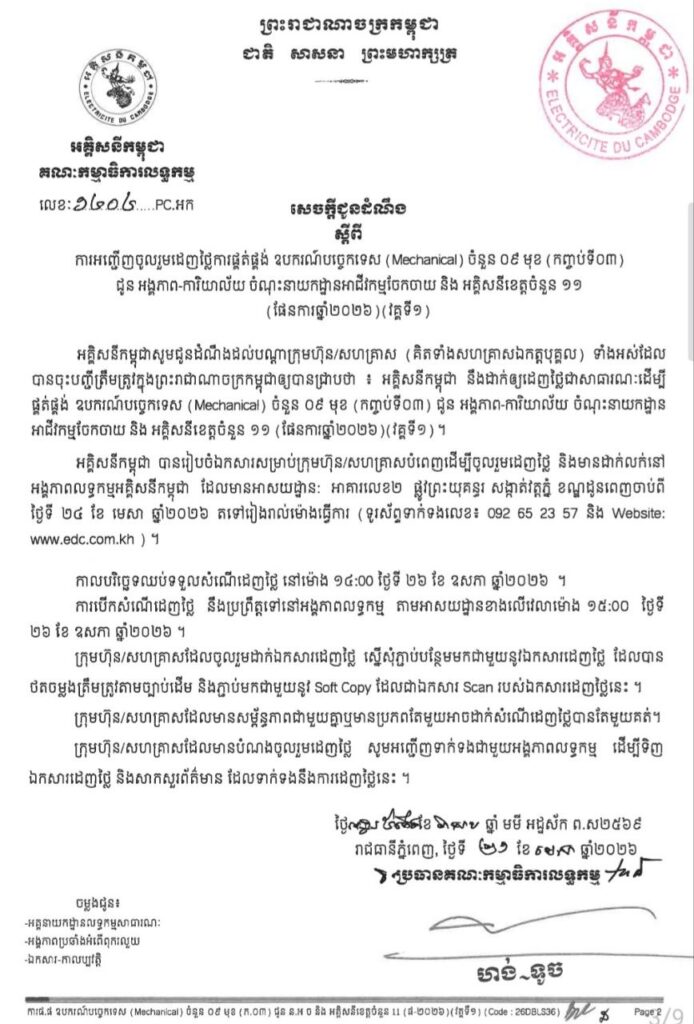 ភ្នំពេញ ៖ អគ្គិសនីកម្ពុជា​ សូមជូនដំណឹងដល់បណ្តាក្រុមហ៊ុន/សហគ្រាស (គិតទាំងសហគ្រាសឯកត្តបុគ្គល) ទាំងអស់ដែល បានចុះបញ្ជីត្រឹមត្រូវ ក្នុងព្រះរាជាណាចក្រកម្ពុជា ឲ្យបានជ្រាបថា ៖ អគ្គិសនីកម្ពុជា នឹងដាក់ឲ្យដេញថ្លៃ ជាសាធារណៈដើម្បី ផ្គត់ផ្គង់ ឧបករណ៍បច្ចេកទេស (Mechanical) ចំនួន ០៩ មុខ (កញ្ចប់ទី០៣) ជូន អង្គភាព-ការិយាល័យ ចំណុះនាយកដ្ឋាន អាជីវកម្មចែកចាយ និង អគ្គិសនីខេត្តចំនួន ១១ (ផែនការឆ្នាំ២០២៦) (វគ្គទី១)។