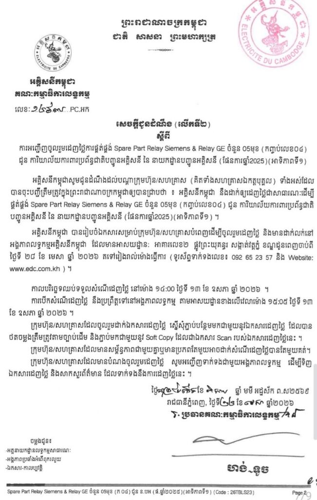 អគ្គិសនីកម្ពុជា បានរៀបចំឯកសារសម្រាប់ក្រុមហ៊ុន/សហគ្រាសបំពេញ ដើម្បីចូលរួមដេញថ្លៃ និងមានដាក់លក់នៅ អង្គភាពលទ្ធកម្មអគ្គិសនីកម្ពុជា ដែលមានអាសយដ្ឋាន: អាគារលេខ២ ផ្លូវព្រះយុគន្ធរ សង្កាត់វត្តភ្នំ ខណ្ឌដូនពេញចាប់ពី ថ្ងៃទី ២៨ ខែ មេសា ឆ្នាំ ២០២៦ តទៅរៀងរាល់ម៉ោងធ្វើការ (ទូរស័ព្ទទាក់ទងលេខ៖ 092 65 23 57 និង Website: www.edc.com.kh) ។