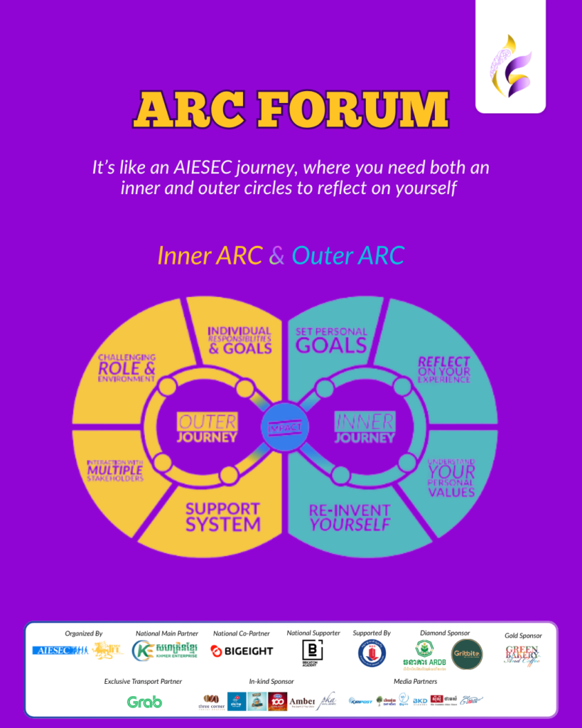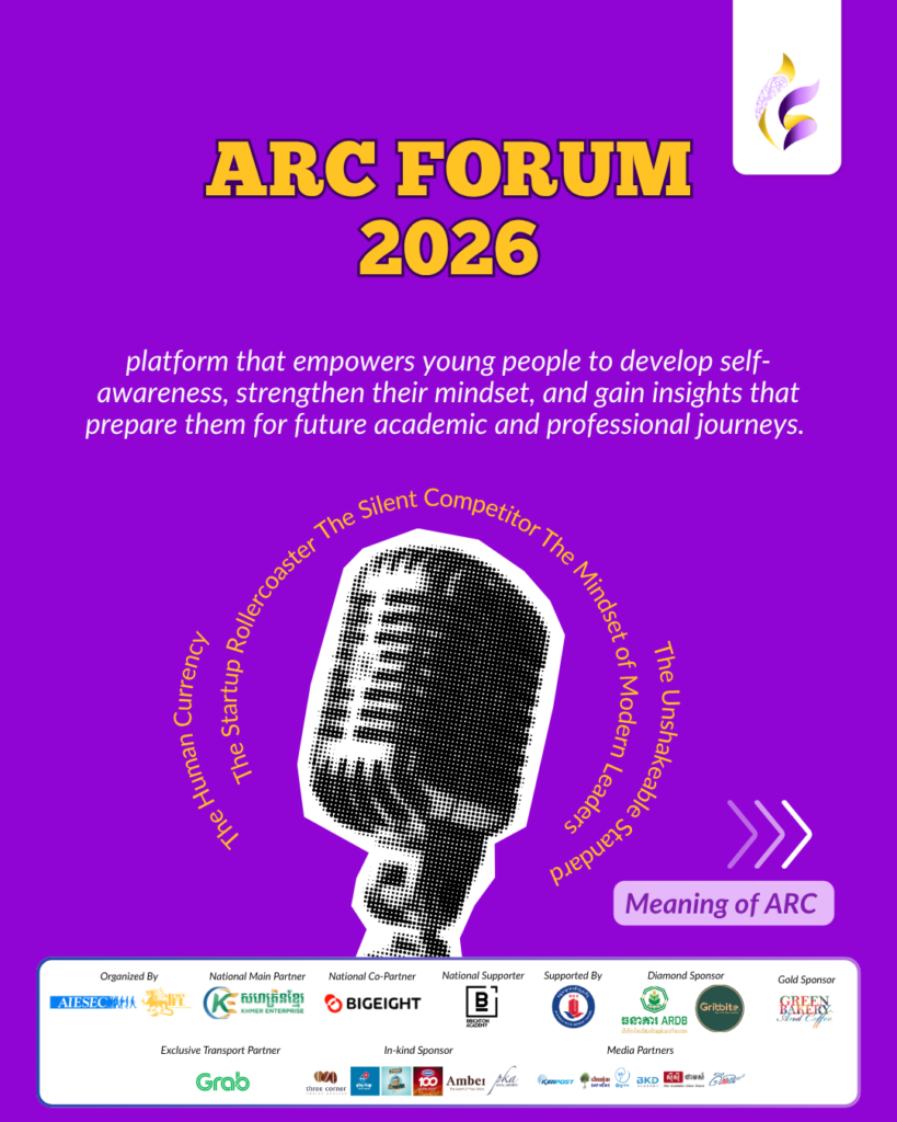 បន្តបេសកកម្មនៃការអភិវឌ្ឍយុវជន នៅឆ្នាំ ២០២៦ នេះ AIESEC in IFL មានកិត្តិយសក្នុងការនាំមកជូនកម្មវិធី ARC Forum 2026 ដែលត្រូវបានរៀបចំឡើងដើម្បីជាវេទិកាដ៏មានតម្លៃ សម្រាប់យុវជនក្នុងការចាប់ផ្តើមដំណើរនៃការបម្លែងខ្លួនឯងពីផ្នែកខាងក្នុង ទៅកាន់ការអនុវត្តជាក់ស្តែងក្នុងពិភពខាងក្រៅ។ កម្មវិធីនេះមានគោលបំណងលើកកម្ពស់ការយល់ដឹងអំពីខ្លួនឯង ពង្រឹងផ្នត់គំនិត និងផ្តល់នូវទស្សនៈជាក់ស្តែងសម្រាប់ការតម្រង់ទិសដៅអនាគតទាំងផ្នែកសិក្សា និងវិជ្ជាជីវៈ។