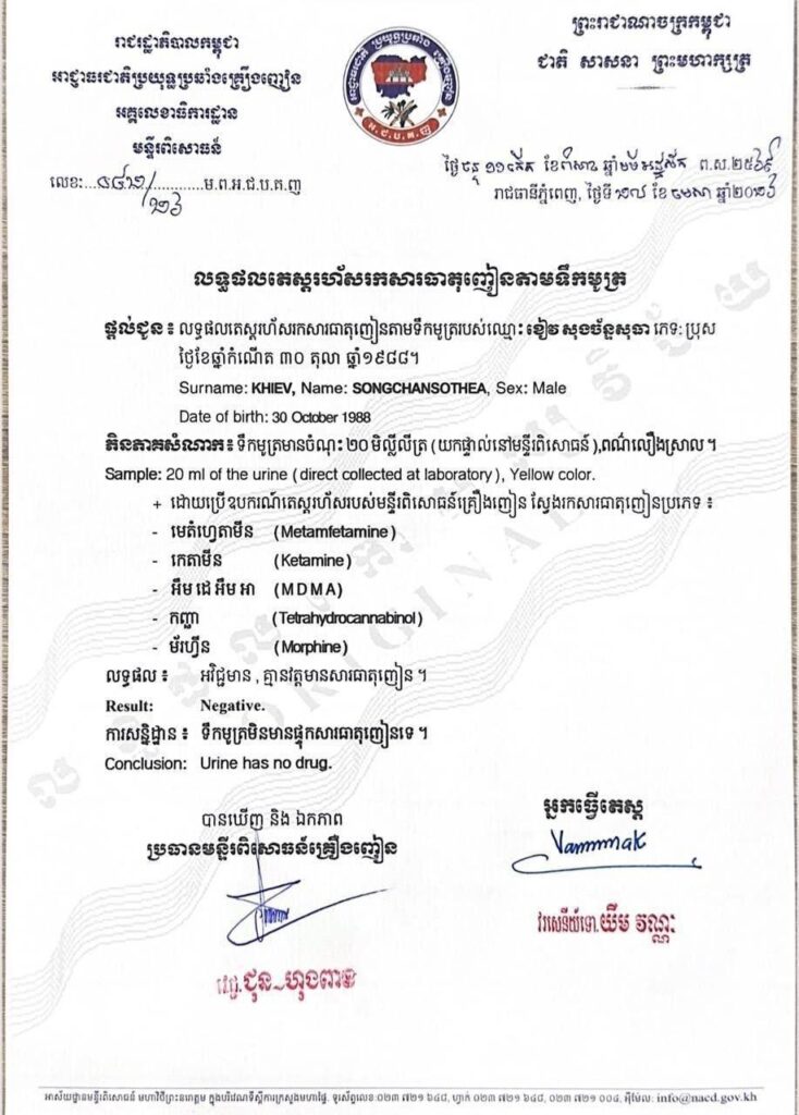 ទន្ទឹមនឹងការអនុវត្តវិន័យ យោងតាមលទ្ធផលត្រួតពិនិត្យរកសារធាតុញៀនតាមទឹកនោមរបស់មន្ទីរពិសោធន៍គ្រឿងញៀន ដែលចុះហត្ថលេខានៅថ្ងៃទី២៤ ខែមេសា ឆ្នាំ២០២៦ បានបង្ហាញថា លោក ខៀវ សុងច័ន្ទសុធា មានលទ្ធផល «អវិជ្ជមាន» ពោលគឺទឹកនោមរបស់លោកមិនមានផ្ទុកសារធាតុញៀនដូចជា មេតំហ្វេតាមីន កេតាមីន អ៊ិចស្តាស៊ី កញ្ឆា ឬម៉ូហ្វីនឡើយ។