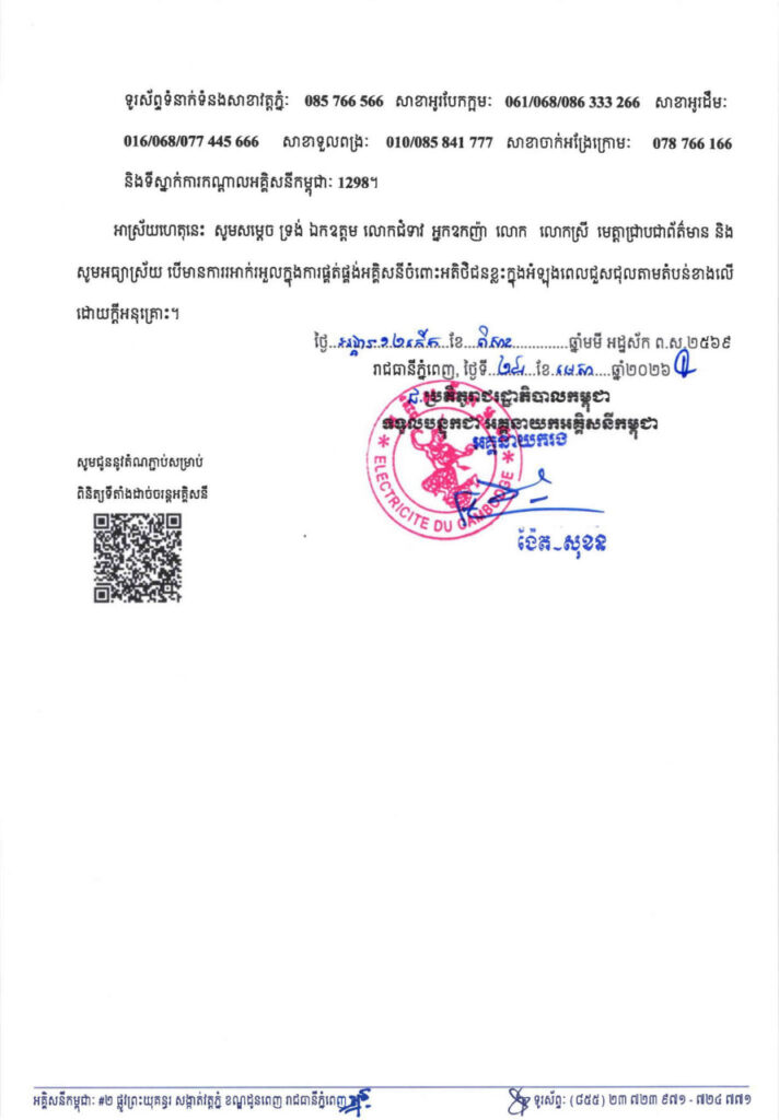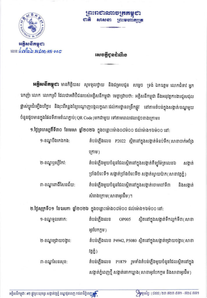 សូមអានសេចក្តីជូនដំណឹង របស់អគ្គិសនីកម្ពុជា ដូចខាងក្រោម ៖