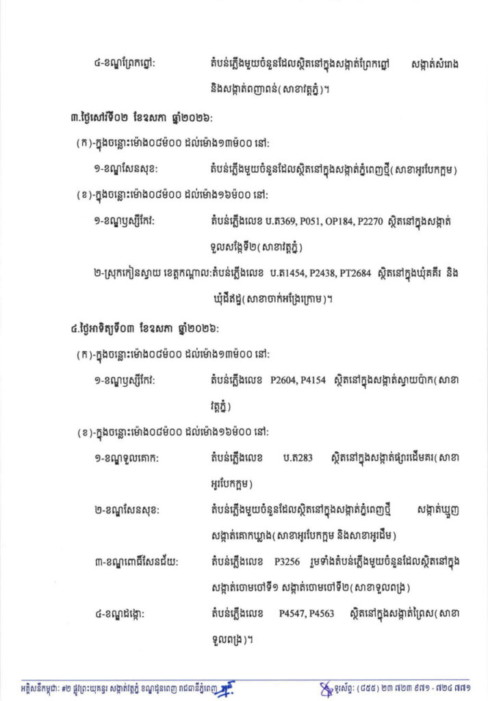 EDC ជូនដំណឹងពីការរអាក់រអួលចរន្ត តាមតំបន់សង្កាត់ ខណ្ឌ មួយចំនួនចាប់ពីថ្ងៃនេះ ដល់ថ្ងៃទី០៣ ខែឧសភា ឆ្នាំ២០២៦ ដើម្បីរុះរើគន្លងខ្សែបណ្តាញ ផ្លាស់ប្តូរ តម្លើង បរិក្ខារ ងាយស្រួលដល់ការដ្ឋានពង្រីកផ្លូវ