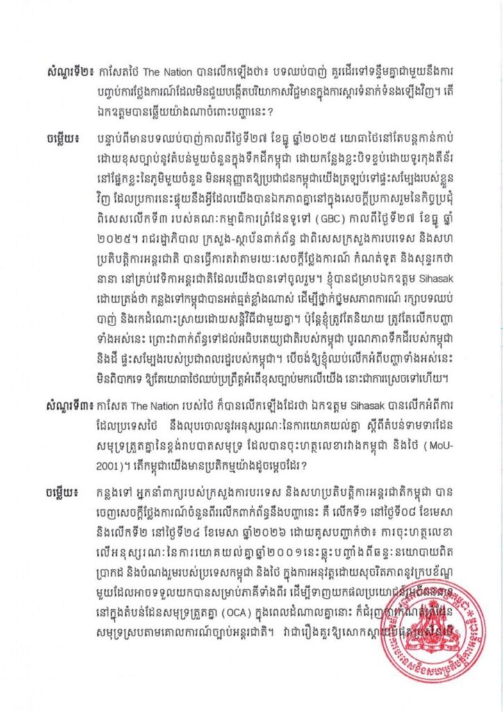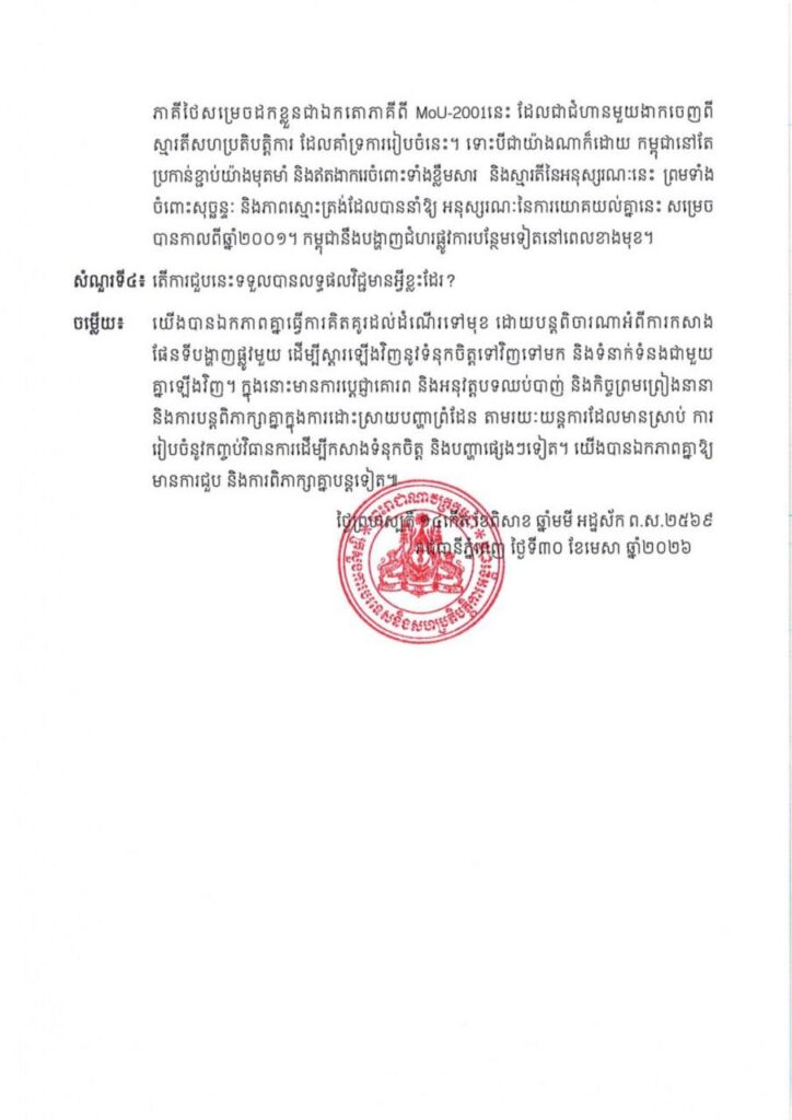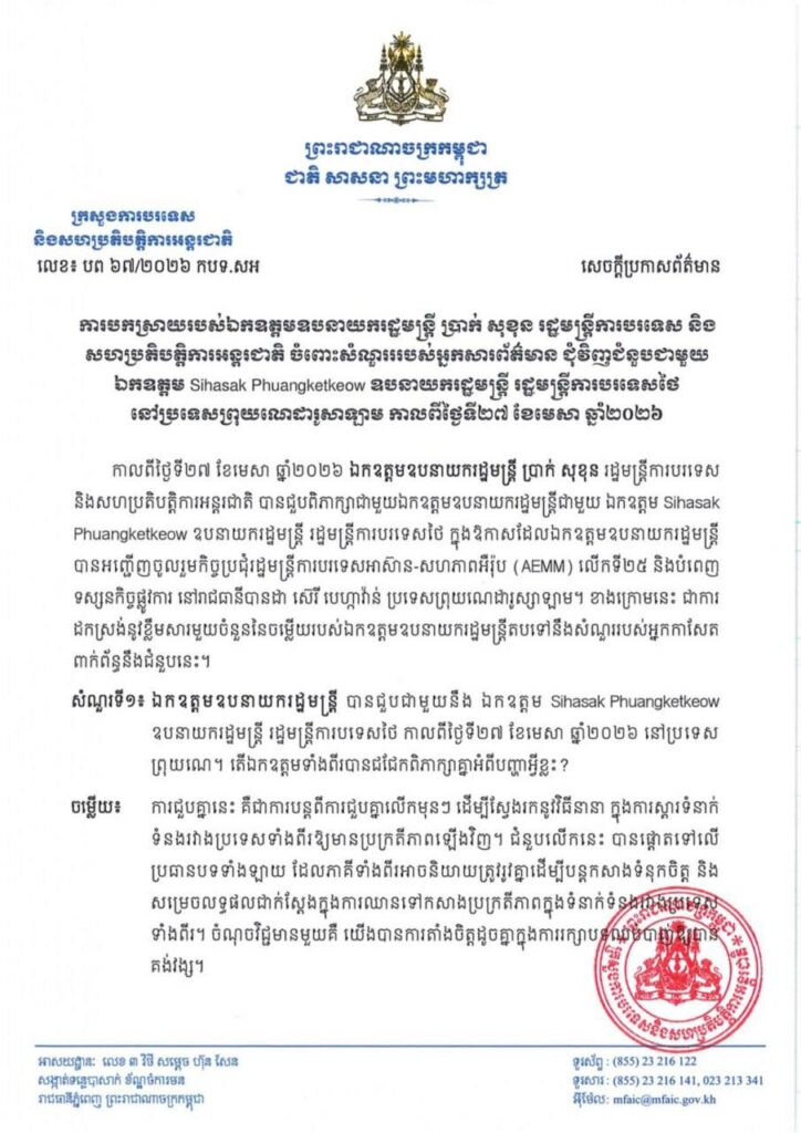 នេះជាការបកស្រាយរបស់លោកឧបនាយករដ្ឋមន្ត្រី ប្រាក់ សុខុន រដ្ឋមន្ត្រីការបរទេស និងសហប្រតិបត្តិការអន្តរជាតិ ចំពោះសំណួររបស់អ្នកសារព័ត៌មាន ជុំវិញជំនួបជាមួយ លោកSihasak Phuangketkeow ឧបនាយករដ្ឋមន្ត្រី រដ្ឋមន្ត្រីការបរទេសថៃ នៅប្រទេសព្រុយណេដារូសាឡាម កាលពីថ្ងៃទី២៧ ខែមេសា ឆ្នាំ២០២៦។