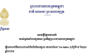ភ្នំពេញ ៖ អ្នកនាំពាក្យ នៃគណៈប្រតិភូ ព្រះរាជាណាចក្រកម្ពុជាប្រចាំមហាសន្និបាតសហភាពអន្តរសភា (IPU) លើកទី១៥១ នៅទីក្រុងហ្សឺណែវ ច្រានចោលទាំងស្រុងនូវរបាយការណ៍មិនពិត និងបំភាន់ ដែលបានផ្សព្វផ្សាយដោយសារព័ត៌មានថៃ The Nation នៅថ្ងៃទី១៩ ខែតុលា ឆ្នាំ២០២៥ ក្រោមចំណងជើងថា “ក្រុមការងារថៃរាយការណ៍ថា កម្ពុជាបង្កើនការវាយប្រហារលើប្រទេសថៃ»។ យោងតាមសេចក្តីថ្លែងការណ៍របស់អ្នកនាំពាក្យគណៈប្រតិភូកម្ពុជាឆ្លើយតបទៅនឹងរបាយការណ៍មិនពិតដែលផ្សាយ ដោយកាសែត The...