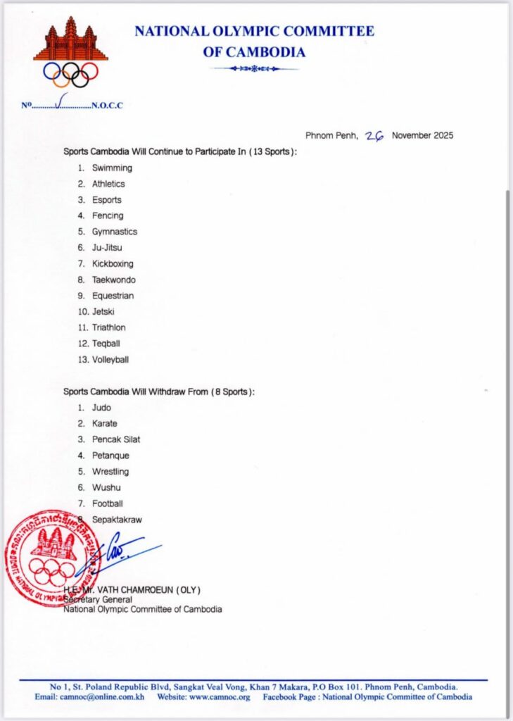 ភ្នំពេញ ៖ គណៈកម្មាធិការជាតិអូឡាំពិកកម្ពុជា (NOCC) និងក្រសួងអប់រំ យុវជន និងកីឡា នៅថ្ងៃទី២៧ ខែវិច្ឆិកា ឆ្នាំ២០២៥ បានចេញសេចក្តីជូនដំណឹង ស្តីពីបច្ចុប្បន្នភាព នៃការចូលរួមប្រកួតកីឡាស៊ីហ្គេម (SEA Games) លើកទី៣៣ នៅប្រទេសថៃ, ដោយបានបន្ថយមកត្រឹម ១៥០នាក់ ក្នុងចំណោម ១៣ប្រភេទកីឡា។